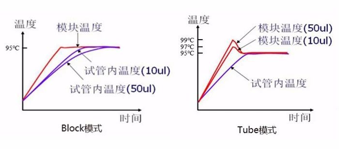 另外,很多PCR儀在加熱模式上有Tube、Block兩種方式可選。這是因為儀器的溫度傳感器在模塊下部,實際上無法測得樣品管內的溫度。一般情況(Block)下,在輸入設定溫度及運行時間時,指的是模塊在到達指定溫度下持續相應的時間,樣品管的溫度不能迅速達到指定的溫度;而Tube模式是先將模塊溫度高于設定溫度,等樣品管溫度到達指定溫度,再將模塊溫度降到指定溫度,這樣能快速使管內溫度達到設定值。不同反應體積和要求可使用不同的模式:普通PCR或體積較大使用Tube模式,當長時間保溫且對溫度過沖要求較高或是體積較小時,可以使用Block模式。